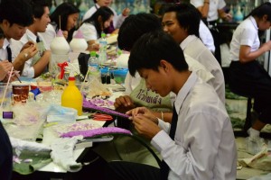 อาจารย์และนักศึกษาสาขาเทคโนโลยีและงานประดิษฐ์สรางสรรค์ คณะเทคโนโลยีคหกรรมศาสตร์ช่วยกันจัดเตรียมดอกไม้ เพื่อใช้ในการรับเสด็จฯ สมเด็จพระเทพรัตนราชสุดาฯ สยามบรมราชกุมารีพระราชดำเนินทรงวางศิลาฤกษ์ และเปิดสังเวชนียสถานจำลอง วัดปัญญานันทาราม จังหวัดปทุมธานี