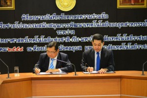รศ.ดร.ประเสริฐ ปิ่นปฐมรัฐ อธิการบดีมหาวิทยาลัยเทคโนโลยีราชมงคล(มทร.)ธัญบุรี ลงนามความร่วมมือเรื่อง “การดำเนินงานเครือข่ายโปรแกรมสนับสนุนการพัฒนาเทคโนโลยีของอุตสาหกรรมไทย” กับ ดร.ณรงค์ ศิริเลิศวรกุล รองผู้อำนวยการสำนักงานพัฒนาวิทยาศาสตร์และเทคโนโลยีแห่งชาติ(สวทช.) ณ ห้องประชุมมังคลอุบล มทร.ธัญบุรี