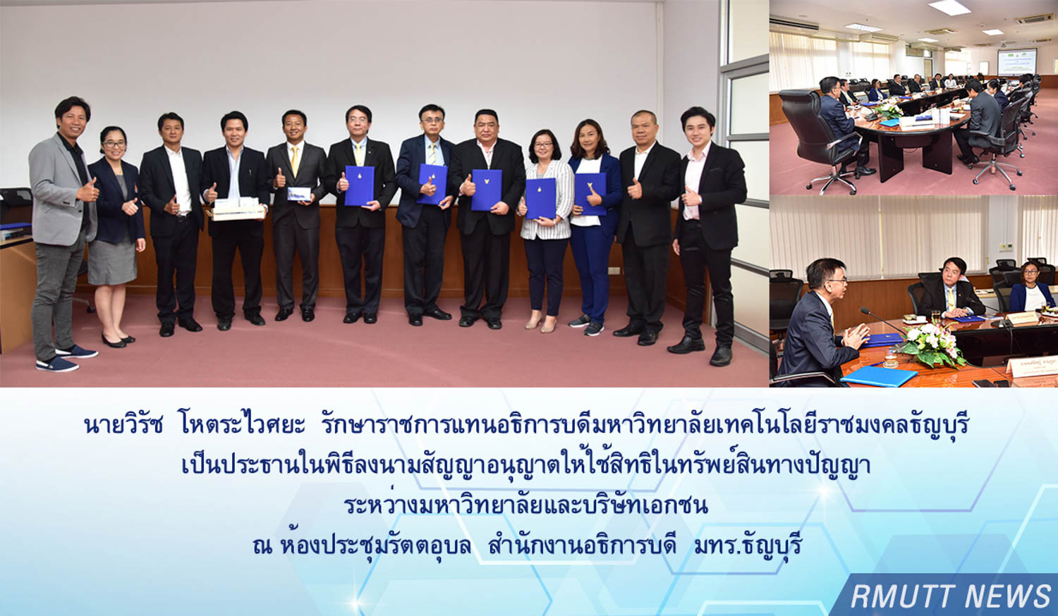 นายวิรัช โหตระไวศยะ รักษาราชการแทนอธิการบดี มทร.ธัญบุรี ลงนามสัญญาอนุญาตให้ใช้สิทธิในทรัพย์สินทางปัญญา ระหว่างมหาวิทยาลัยและบริษัทเอกชน