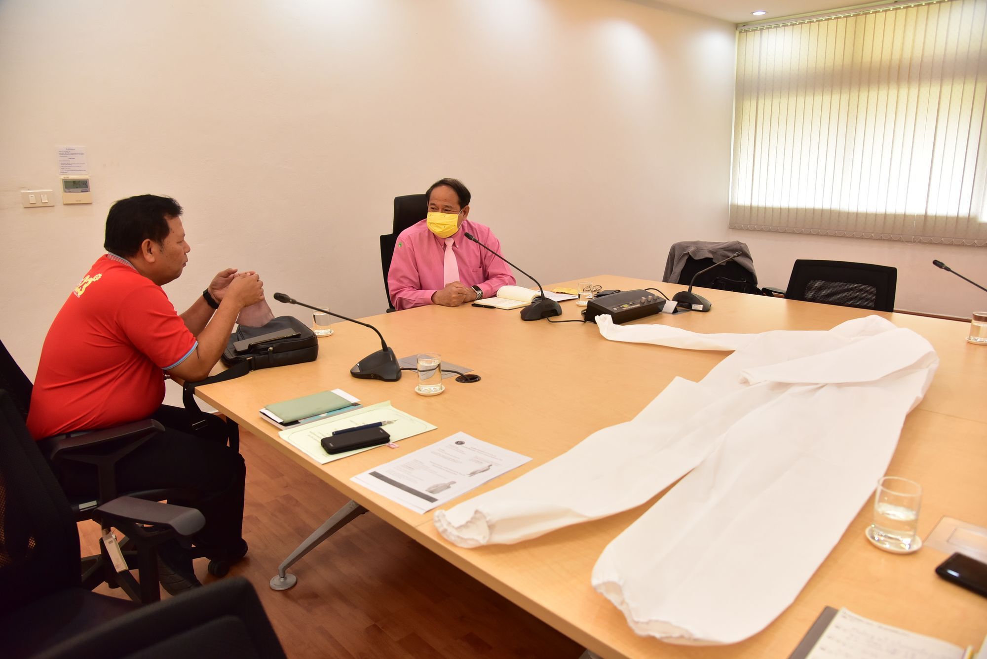 นายราเมศ ตีวารี กรรมการผู้จัดการ บริษัท โกลแฟ็บ จำกัด เข้าหารือกับ ผศ.ดร.สมหมาย ผิวสอาด อธิการบดีมหาวิทยาลัยเทคโนโลยีราชมงคลธัญบุรี พร้อมผู้บริหาร ในการร่วมกันผลิตชุดหมีป้องกันสารเคมี และชุดอุปกรณ์ป้องกันส่วนบุคคล (PPE) ณ ห้องประชุมธัญกาฬ มทร.ธัญบุรี