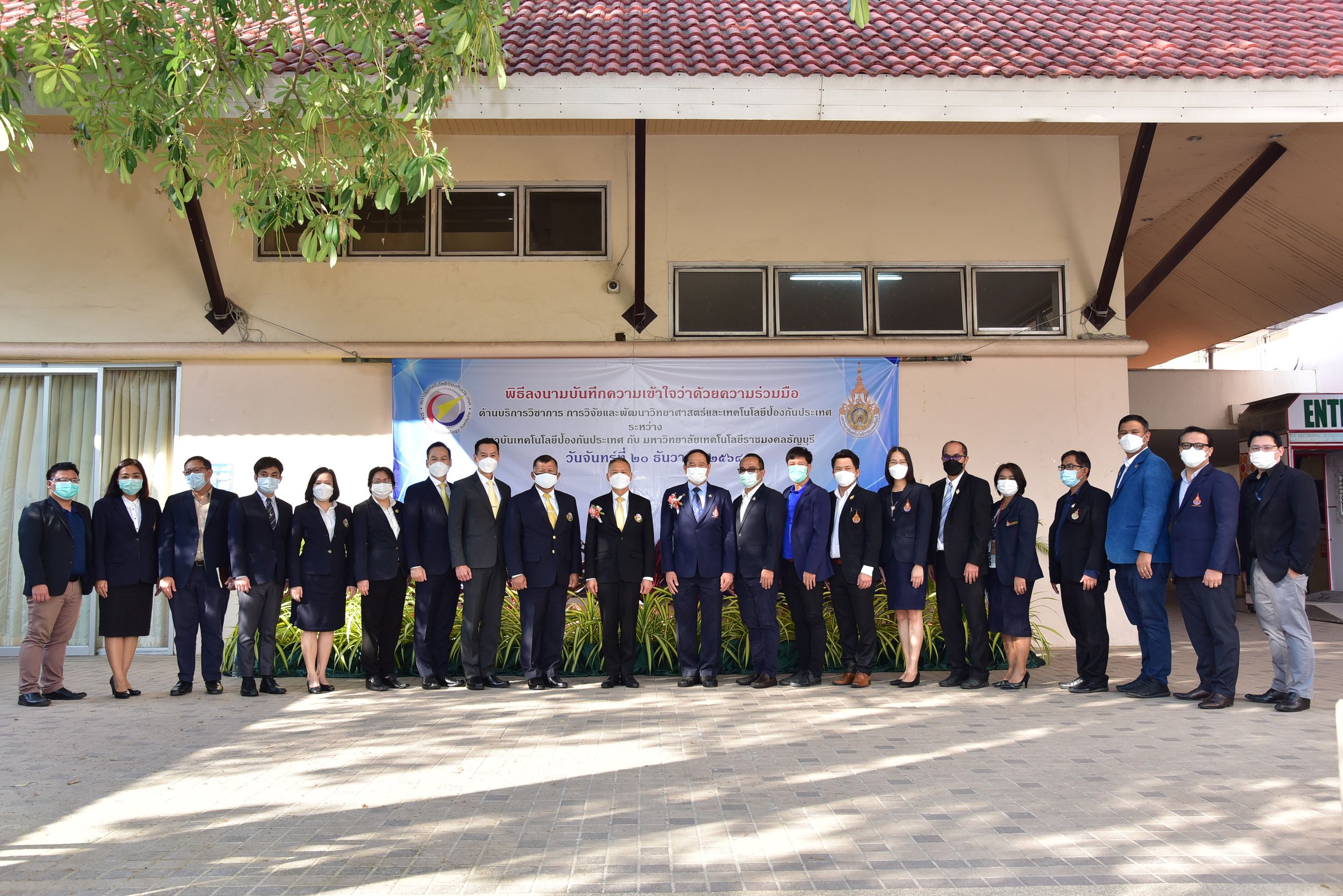 รศ.ดร.สมหมาย ผิวสอาด อธิการบดีมหาวิทยาลัยเทคโนโลยีราชมงคลธัญบุรี และ พลอากาศเอก ดร.ปรีชา ประดับมุข ผู้อำนวยการสถาบันเทคโนโลยีป้องกันประเทศ ลงนามบันทึกความเข้าใจว่าด้วยความร่วมมือด้านบริการวิชาการ การวิจัยและพัฒนาวิทยาศาสตร์และเทคโนโลยีป้องกันประเทศ เพื่อถ่ายทอดเทคโนโลยีและแลกเปลี่ยนองค์ความรู้ระหว่างบุคลากรของหน่วยงาน โดยมุ่งเน้นให้เกิดประโยชน์สูงสุดแก่ประเทศชาติ ณ ห้องประชุมมังคลอุบล มทร.ธัญบุรี 20 ธันวาคม 2564
