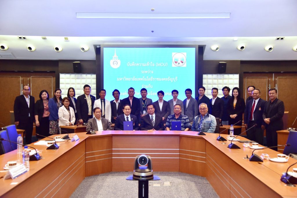 รศ.ดร.สมหมาย ผิวสอาด อธิการบดีมหาวิทยาลัยเทคโนโลยีราชมงคลธัญบุรี นายวีระศักดิ์ วงษ์สมบัติ นายกสภามหาวิทยาลัย ลงนามบันทึกความเข้าใจกับ นายชูพงศ์ คำจวง นายกองค์การบริหารส่วนจังหวัดสกลนคร ในการพัฒนาและส่งเสริมความรู้ด้านวิทยาศาสตร์ และนวัตกรรมในระดับท้องถิ่นร่วมกัน วันที่ 20 เมษายน 2566 ณ ห้องประชุมมังคลอุบล มทร.ธัญบุรี