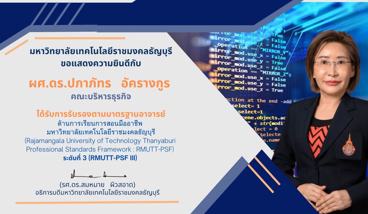 ผู้ได้รับการรับรองตามมาตรฐานอาจารย์ด้านการเรียนการสอนมืออาชีพมหาวิทยาลัยเทคโนโลยีราชมงคลธัญบุรี (Rajamangala University of Technology Thanyaburi Professional Standards Framework :RMUTT-PSF) ระดับที่ ๓ (RMUTT-PSF III) จำนวน ๓ ราย ได้แก่