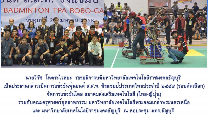 กิจกรรม มทร.ธัญบุรี นายวิรัช โหตระไวศยะ รองอธิการบดีมหาวิทยาลัยเทคโนโลยีราชมงคล(มทร.)ธัญบุรี เป็นประธานกล่าวเปิดการแข่งขันหุ่นยนต์ ส.ส.ท. ชิงแชมป์ประเทศไทย ประจำปี ๒๕๕๘ (รอบคัดเลือก) ตุลาคม 21, 2015 nattapol suebsai เปิดการแข่งขัน ̵ Read more