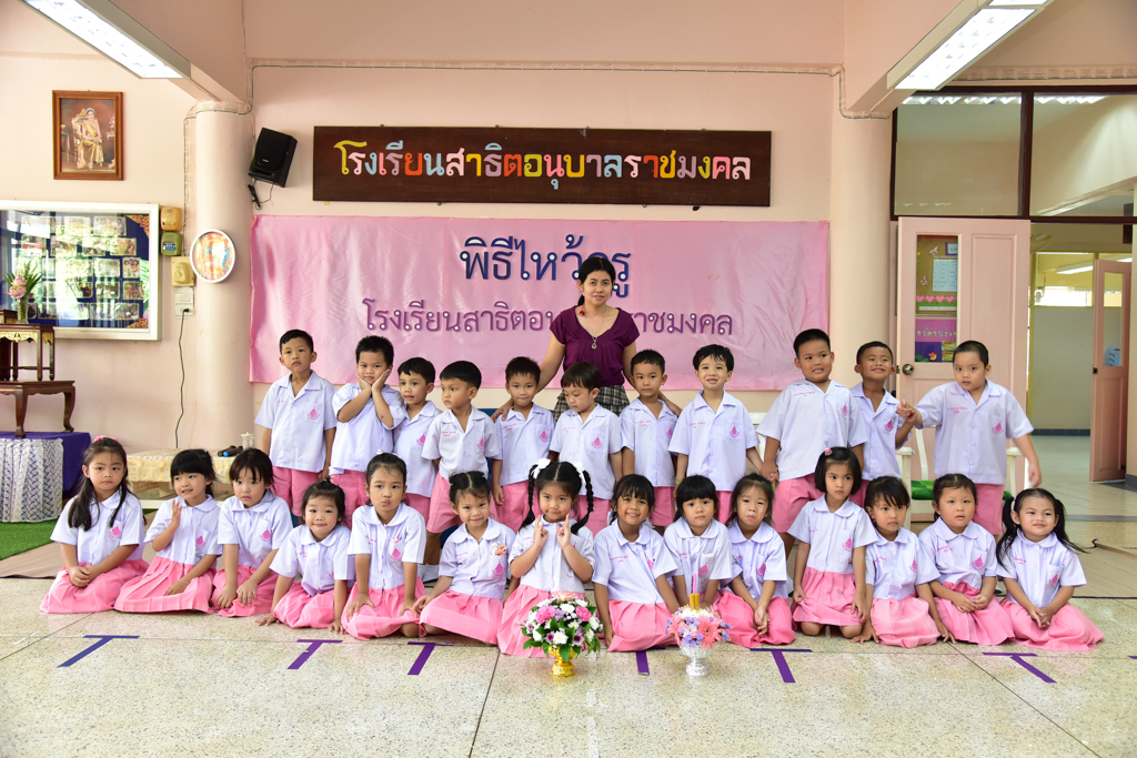 นางสาวจีรวัฒน์ เหรียญอารีย์ คณบดีคณะเทคโนโลยีคหกรรมศาสตร์ เป็นประธานในพิธีไหว้ครู โรงเรียนสาธิตอนุบาลราชมงคล ประจำปีการศึกษา 2561