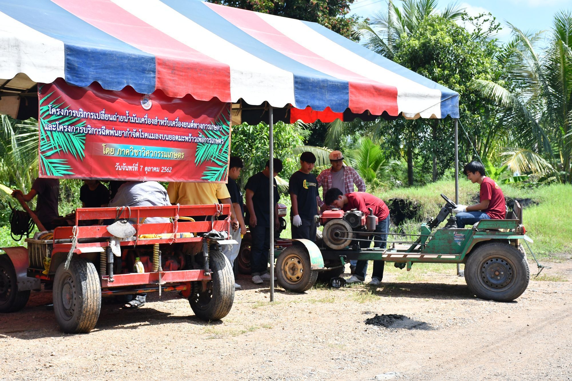 อาจารย์และนักศึกษา ภาควิชาวิศวกรรมเกษตร ลงพื้นที่บริการเปลี่ยนถ่ายน้ำมันเครื่องยนต์ทางการเกษตรฟรี และบริการวิชาการสาธิตเครื่องฉีดพ่นยากำจัดโรคบนยอดมะพร้าว