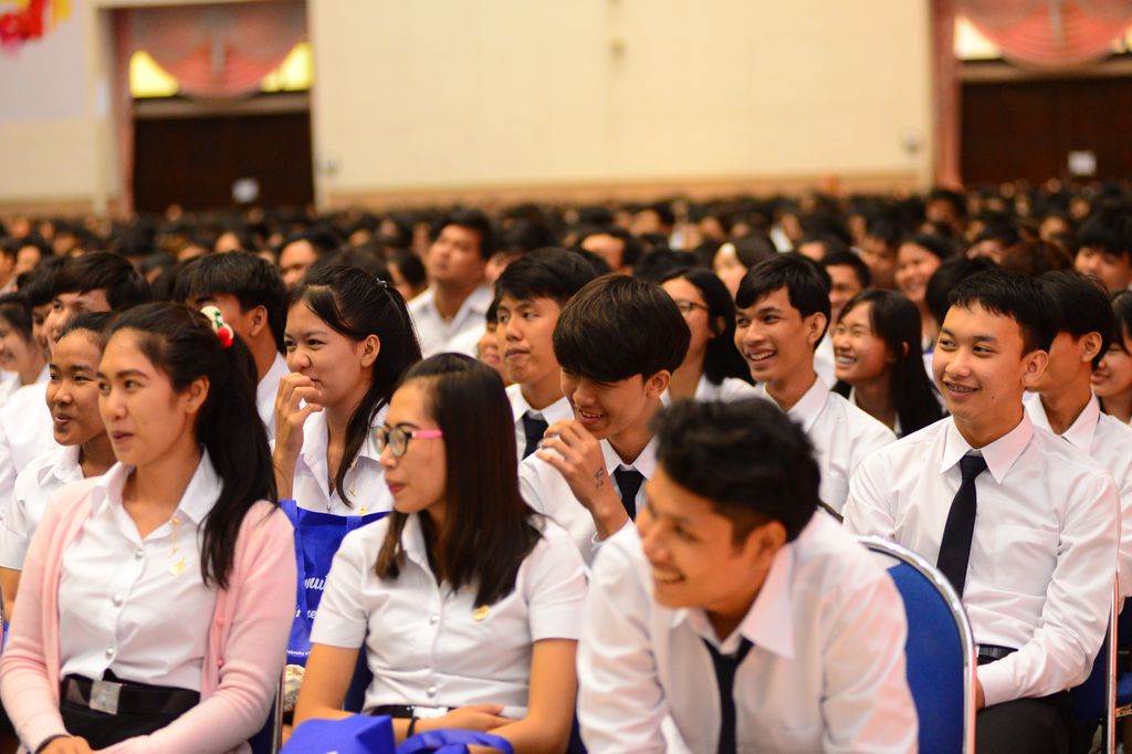 รศ.ดร.ประเสริฐ ปิ่นปฐมรัฐ อธิการบดีมหาวิทยาลัยเทคโนโลยีราชมงคล(มทร.)ธัญบุรี ทักทายนักศึกษาใหม่และผู้ปกครอง อย่างเป็นกันเอง ในการปฐมนิเทศนักศึกษาใหม่และประชุมผู้ปกครอง ประจำปีการศึกษา 2559 ณ หอประชุม มทร.ธัญบุรี