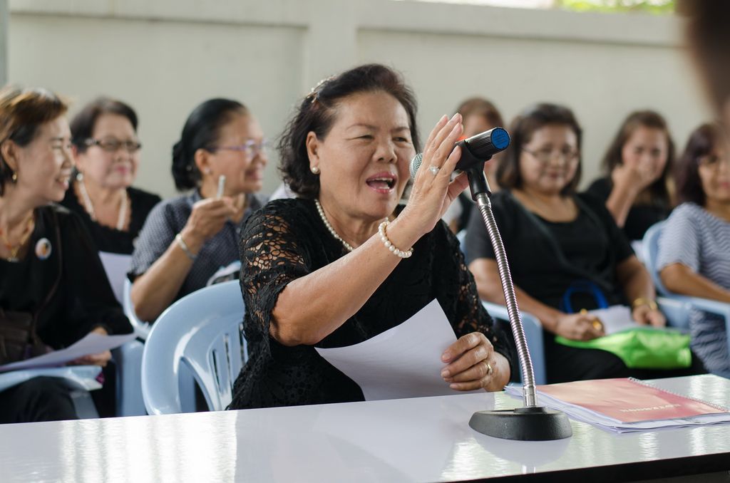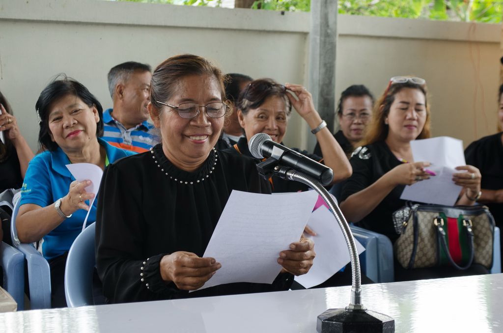 นางสว่างจิต วีระวงศ์ ผู้เข้าอบรม การได้มาอบรมในครั้งนี้ทำให้ได้ความรู้ในการไปปฏิบัติงานเสียงตามสายอย่างมากมาย ซึ่งในตอนแรกก็มีความตื่นเต้น ไม่รู้ว่าตัวเองจะสามารถจัดรายการเสียงตามสายได้ดีหรือไม่ แต่พอได้เข้าร่วมโครงการก็รู้สึกสนุกสนานและผ่อนคลาย และชอบที่ได้ทำกิจกรรม การเขียนบท การฝึกใช้ไมโครโฟน และการอ่านออกเสียง กับนักศึกษา อาจารย์ และเพื่อนๆในชุมชน