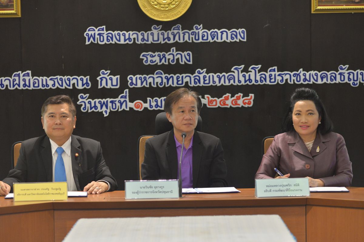 รศ.ดร.ประเสริฐ ปิ่นปฐมรัฐ อธิการบดีมหาวิทยาลัยเทคโนโลยีราชมงคล(มทร.)ธัญบุรี ลงนามความร่วมมือการพัฒนาฝีมือแรงงานและทางวิชาการ กับหม่อมหลวงปุณฑริก สมิติ อธิบดีกรมพัฒนาฝีมือแรงงาน