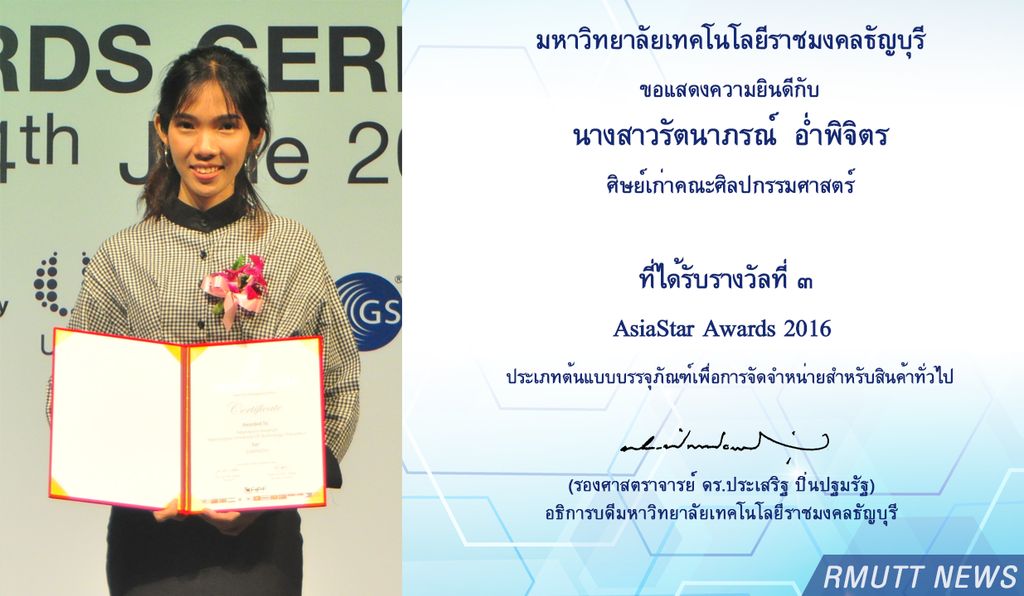 ขอแสดงความยินดีกับนักศึกษาที่ได้รับรางวัล ต้นแบบบรรจุภัณฑ์เพื่อการจัดจำหน่ายสำหรับสินค้าทั่วไป AsiaStar Awards 2016 และ ThaiStarPackaging Awards 2017 เมื่อวันที่ 14 มิถุนายน 2560