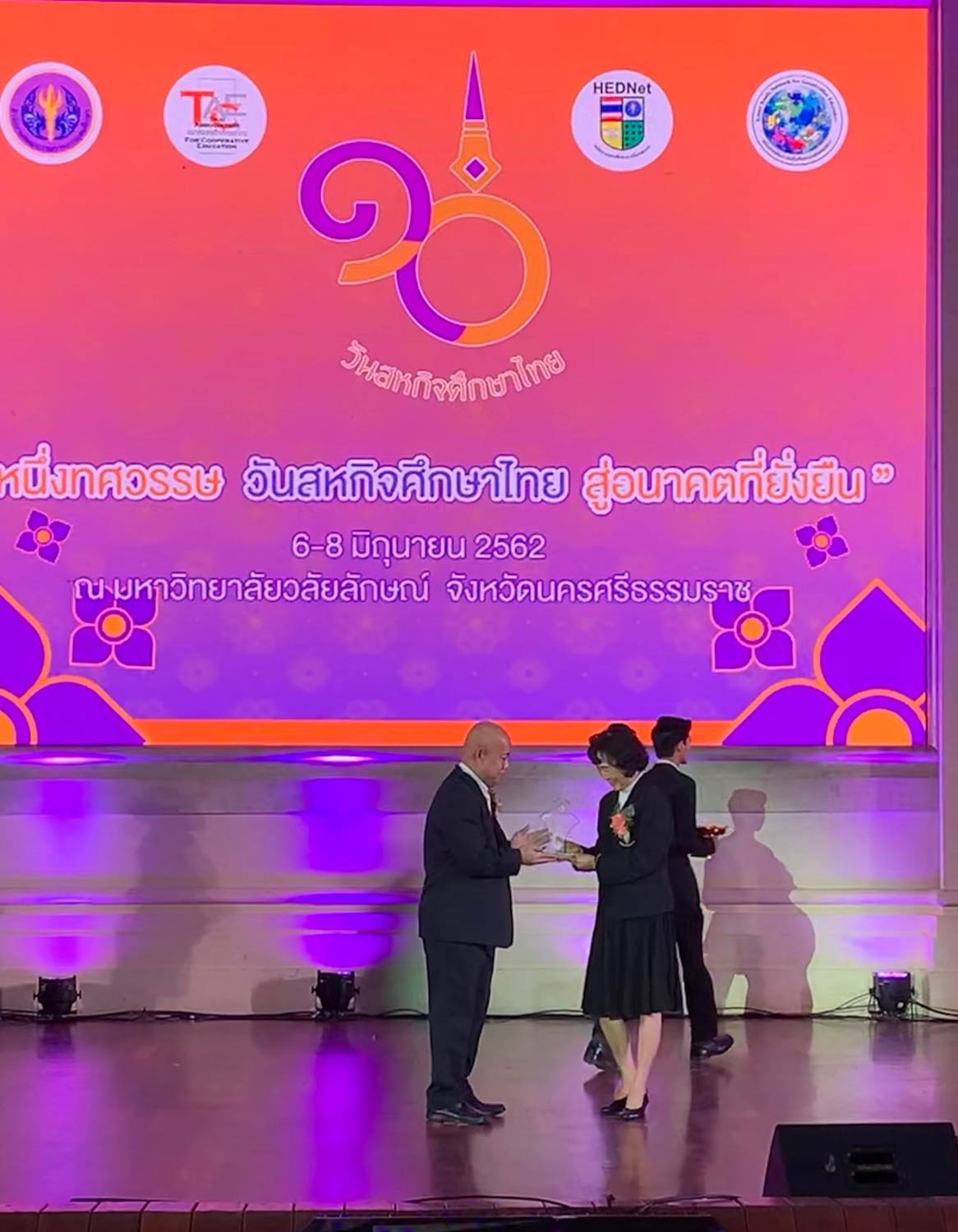 ดร.กิตติวัณณ์ นิ่มเกิดผล ผู้อำนวยการสำนักสหกิจศึกษา มหาวิทยาลัยเทคโนโลยีราชมงคลธัญบุรี เป็นผู้เข้ารับมอบโล่รางวัลสถานศึกษาดำเนินการนวัตกรรมสหกิจศึกษาดีเด่นระดับชาติ ประจำปี 2562