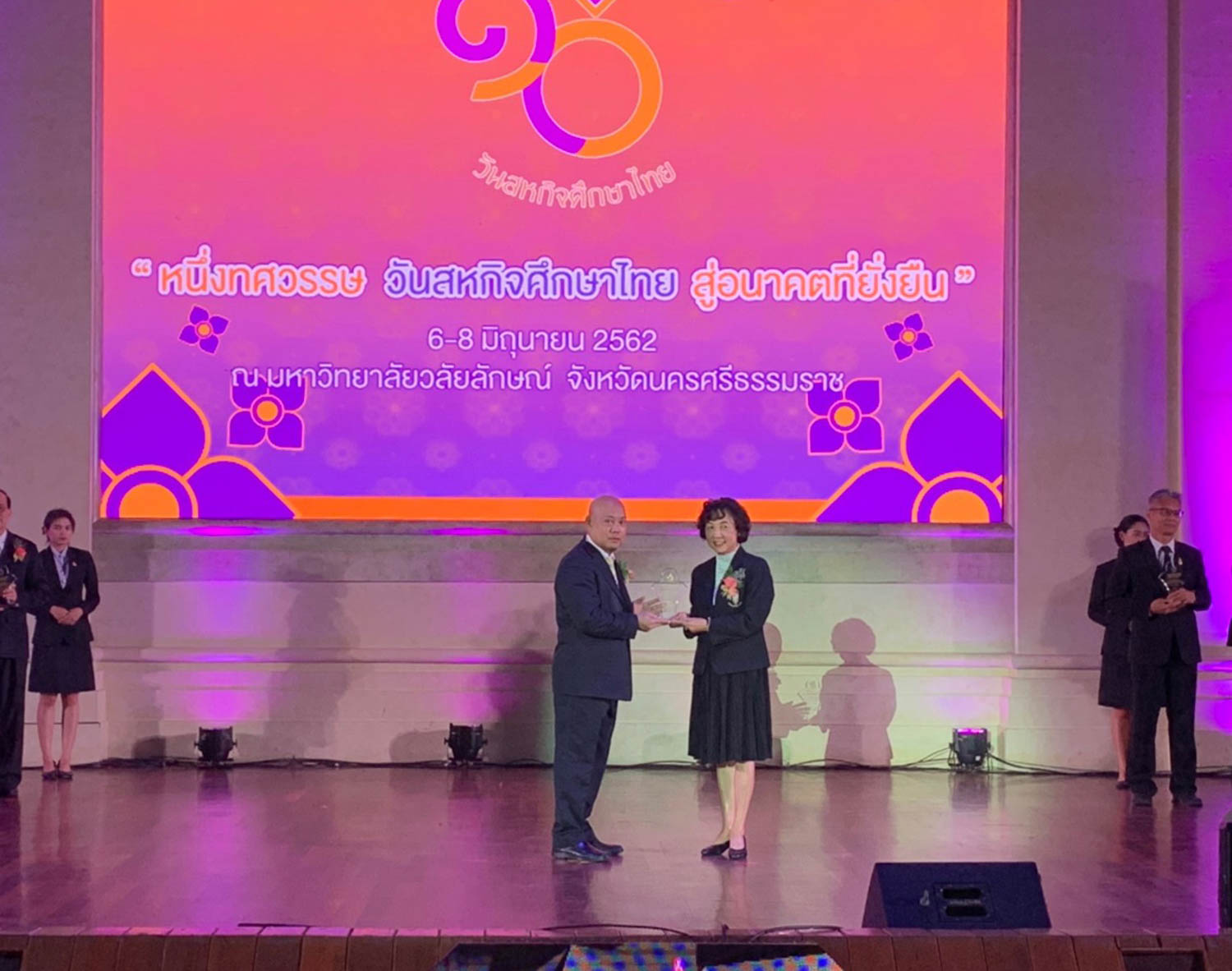 ดร.กิตติวัณณ์ นิ่มเกิดผล ผู้อำนวยการสำนักสหกิจศึกษา มหาวิทยาลัยเทคโนโลยีราชมงคลธัญบุรี เป็นผู้เข้ารับมอบโล่รางวัลสถานศึกษาดำเนินการนวัตกรรมสหกิจศึกษาดีเด่นระดับชาติ ประจำปี 2562