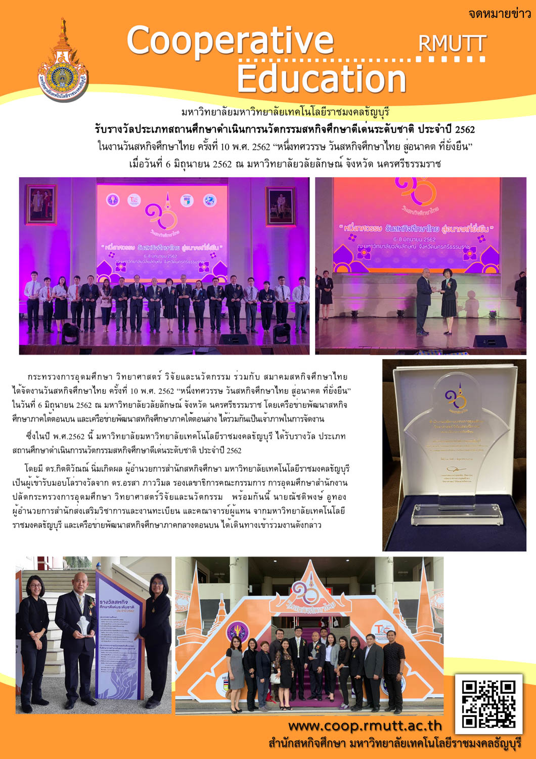 ดร.กิตติวัณณ์ นิ่มเกิดผล ผู้อำนวยการสำนักสหกิจศึกษา มหาวิทยาลัยเทคโนโลยีราชมงคลธัญบุรี เป็นผู้เข้ารับมอบโล่รางวัลสถานศึกษาดำเนินการนวัตกรรมสหกิจศึกษาดีเด่นระดับชาติ ประจำปี 2562
