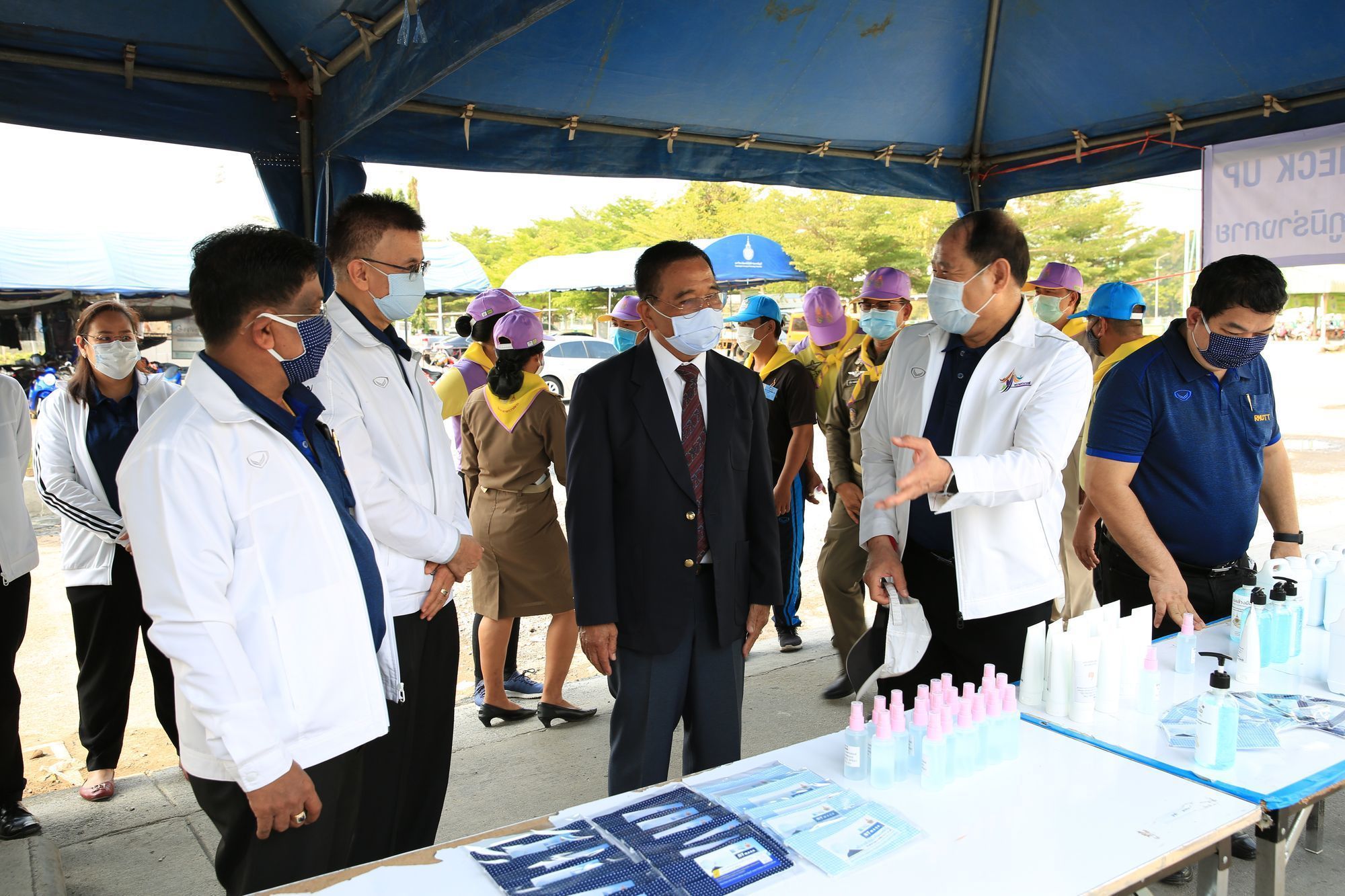 อธิการบดี และผู้บริหาร นำเจลล้างมือ แอลกอฮอล์ และหน้ากากผ้า แจกจ่ายให้ประชาชนในชุมชนตลาดพรธิสาร